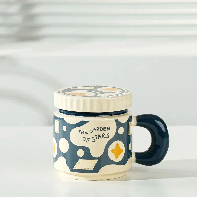 Ceramic Cup Chessboard Flower Pattern Coffee with Lid Handmade Cup